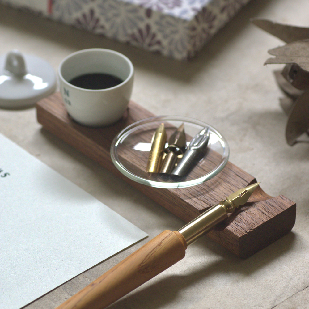 「書のペデスタル」つけペン、ペン先、インク壺を一つにまとめる木と真鍮の台座。日々のカリグラフィー、イラスト、手紙を書くなどひとときのパートナーにどうぞ。