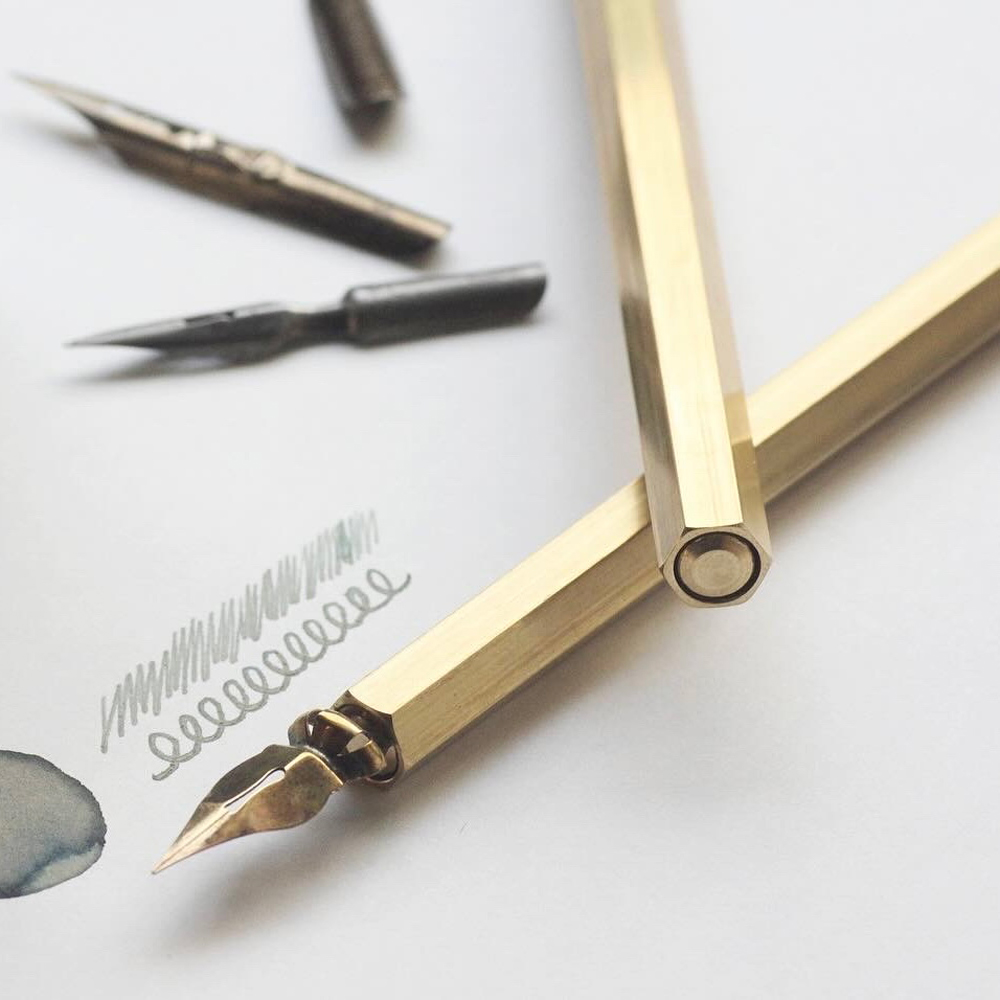 「Brass Nib Holder #103 “Double Point”」鉛筆型の六角柱を形どった真鍮の無垢材で製作。両側にペン先を掴む機構がついているつけペン軸です。
