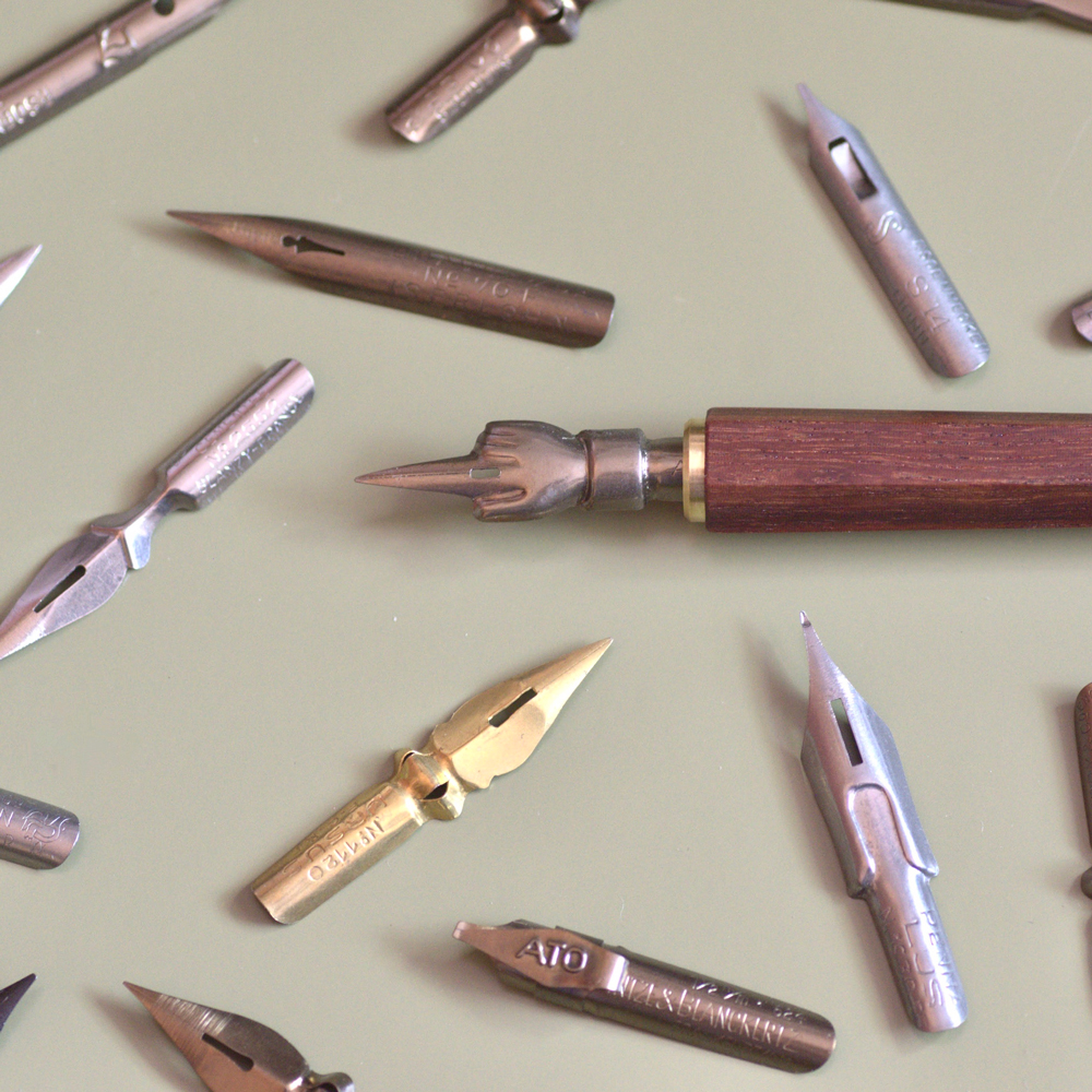 「Nib」ヨーロッパから仕入れた、ヴィンテージのペン先を取り揃えています。30種類以上あるペン先を試して、お気に入りを一緒に見つけましょう。