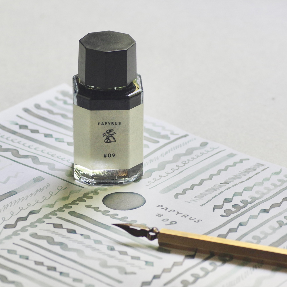 「PAPYRUS INK #09」古典インクは、若草色から酸化して古ぼけた灰緑色に変化します。落ち着いた色合いで、特別な想いを伝える手紙や日記、覚書などの普段使いにもおすすめです。