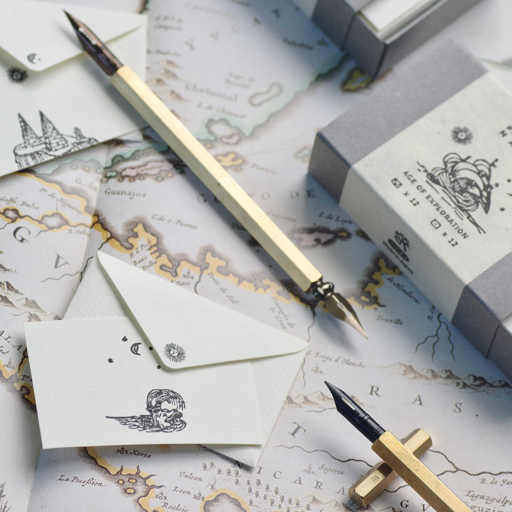 手彫りの版で一枚一枚刷り上げる紙製品や、真鍮を削り出したオリジナルのつけペン軸、木工作家ゴロンドリーナさんと共同制作している木製のつけペン軸など、書くことが楽しくなるようなデスクトップアイテムを自分たちの手で作り、販売しています。