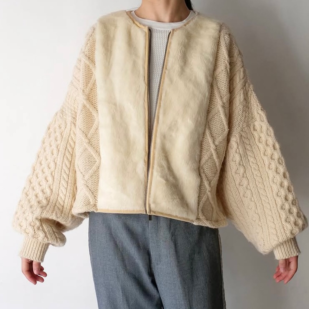 70年代フィッシャーマンニットとフェイクファーベストをドッキングしたオリジナルリメイクジャケット