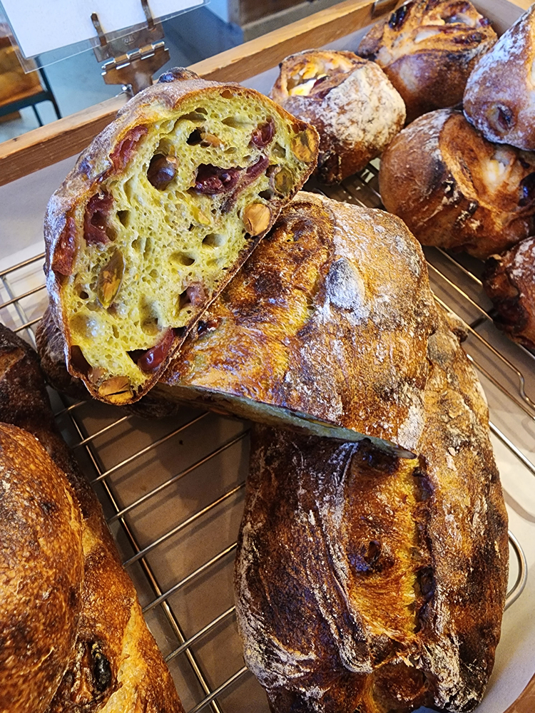 「ピスタチオとクランベリーのカンパーニュ」高加水の生地が特徴です。