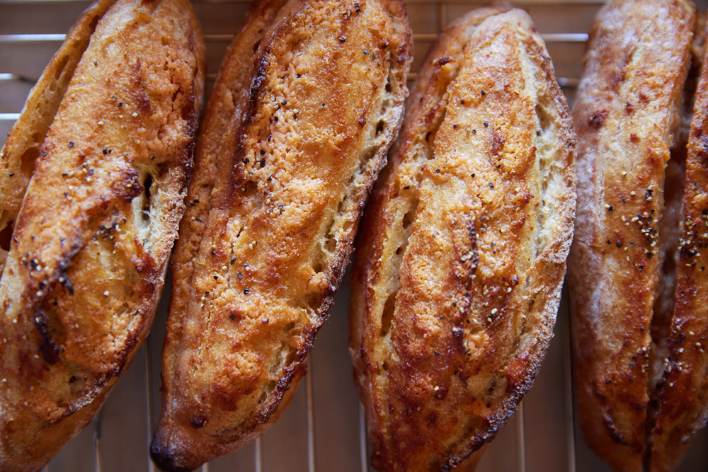 「明太フランス」自家製マヨネーズに本場福岡の明太子を使用。生地はもちもちのバゲット。
