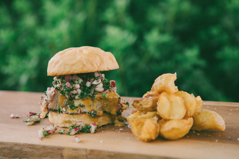 炭火で4時間ローストした信州産豚肉を挟んだハンバーガー