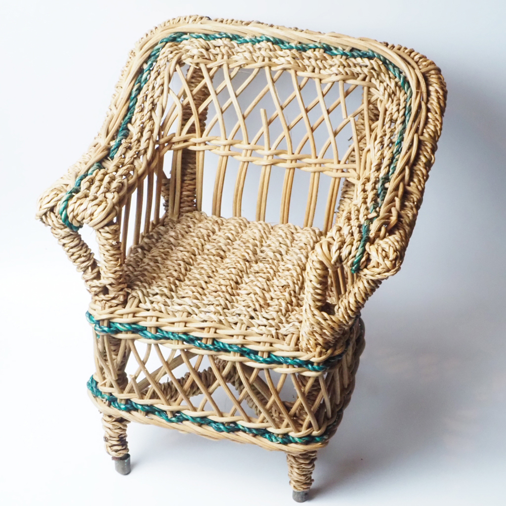 グリーンのラインがポイントの藤製ドール用チェア。小さめのテディベアなどを置いても可愛いです。