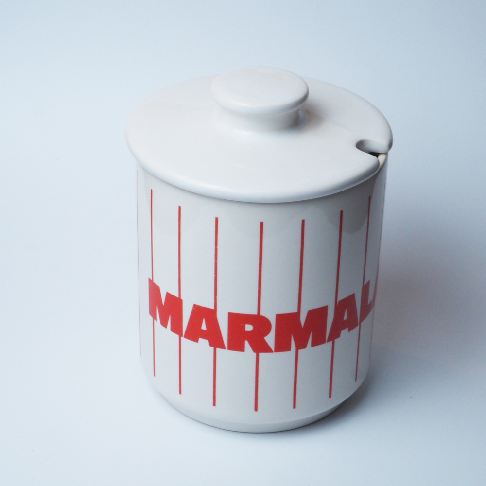 イギリスHORNSEA社製マーマレードポット。赤いストライプに赤い太文字が印象的です。