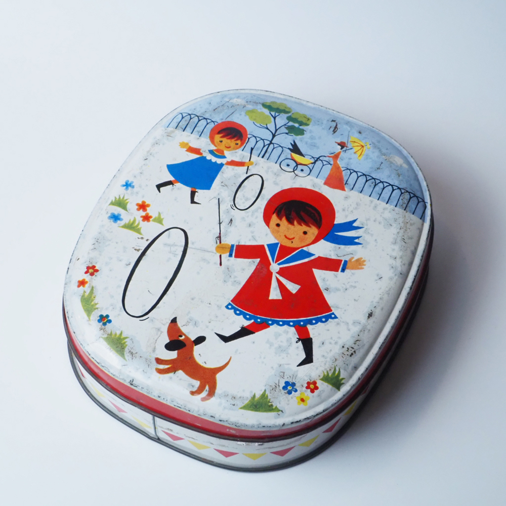 「イギリスの古いビスケット缶」輪回しで遊ぶ子供たちのイラストが可愛らしいです。