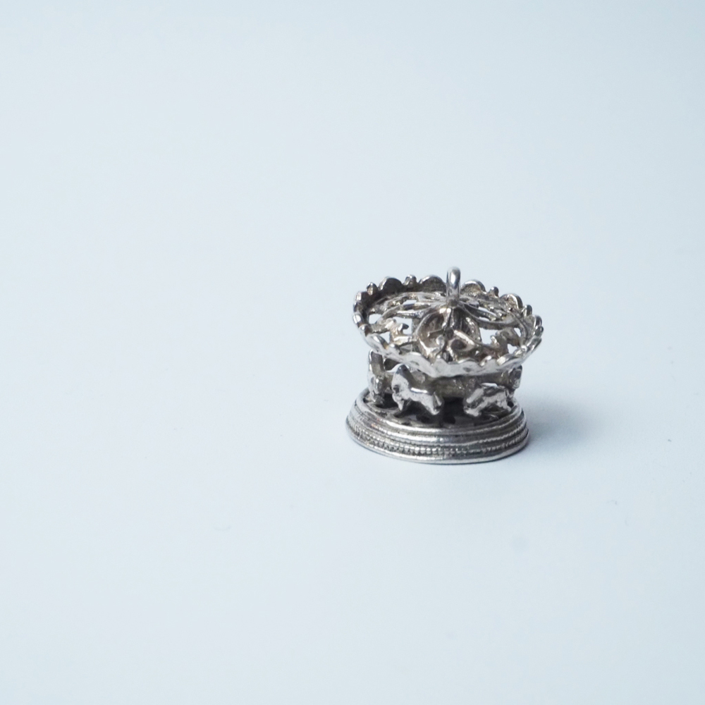 指先ほどのサイズのメリーゴーランドはイギリス製ヴィンテージシルバーチャーム。このサイズで回る仕掛け付きです。