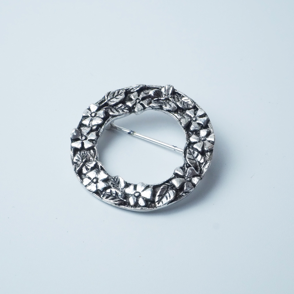 ピューター製のリース型ブローチ。お花の周りを蝶が飛ぶメルヘンなデザイン。