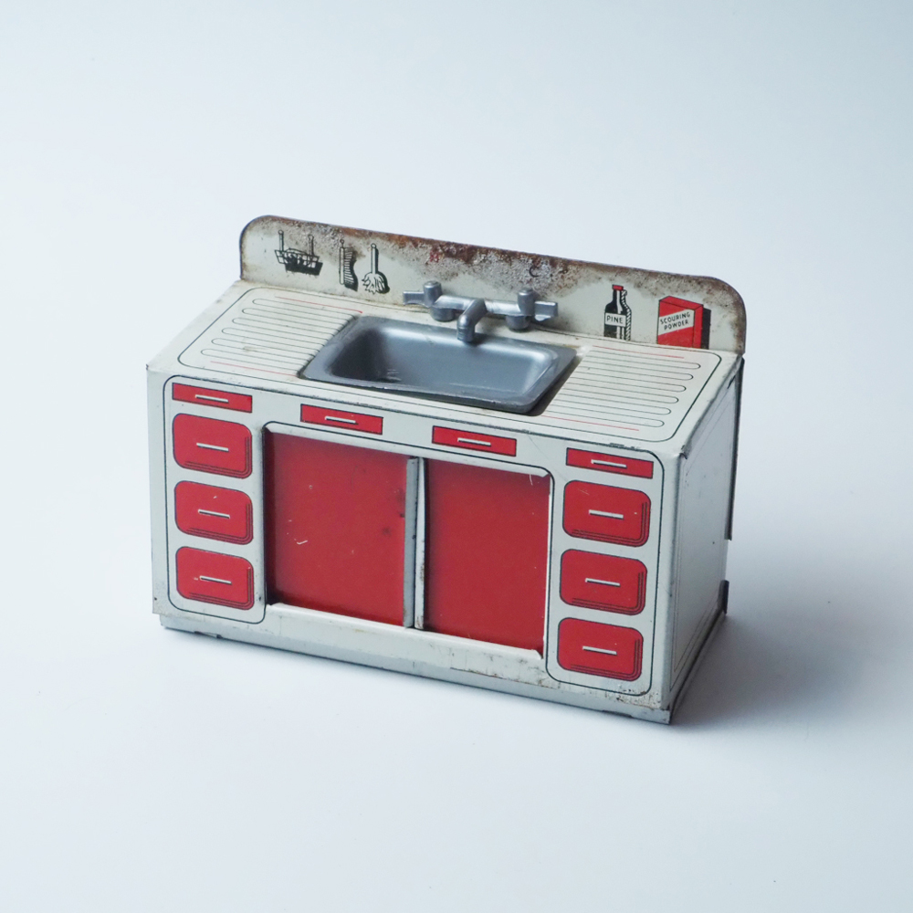 イギリスBRIM TOY社製ブリキのミニチュアキッチン。立体と平面が組み合わさったデザインがレトロで素敵です。