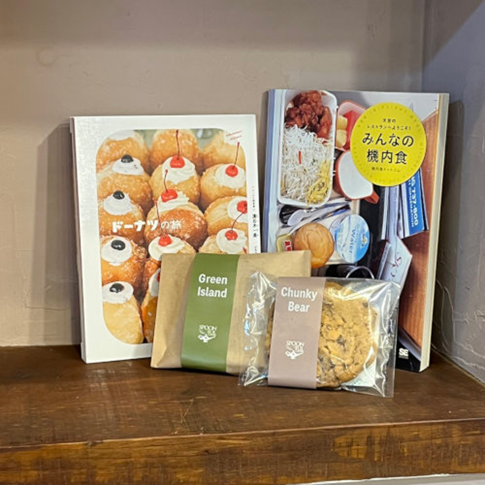 各地のドーナツやいろいろな国の機内食を紹介した本と、抹茶とビターチョコ、キャラメルチョコとピーカンナッツのクッキー