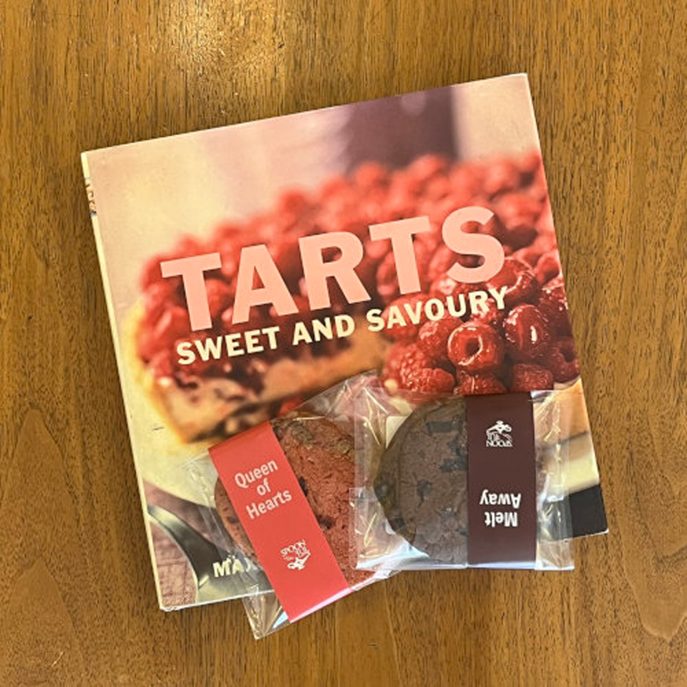 いろいろなタルトの作り方を紹介したレシピ本と、ホワイトチョコとクランベリーのクッキー