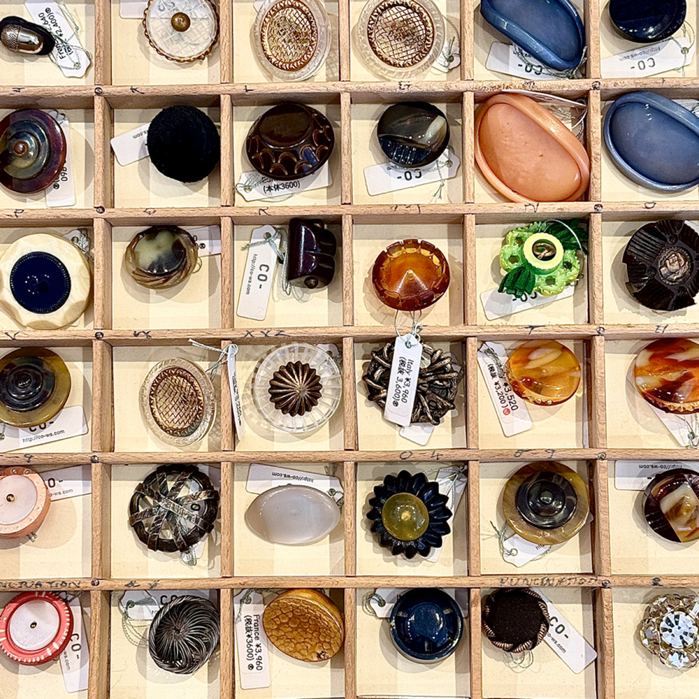 「CO-(コー)」は東神田にあるアンティークボタン、ヴィンテージボタンの専門店です。「創造」と「想像」をテーマに、欧米から直接買い付けてきた個性あふれるアンティークボタン、ヴィンテージボタンを販売しています。また、ボタンを楽しむための付け替えリングやブローチなどのアクセサリー、ヴィンテージボタンからヒントを得たオリジナルボタンなども提案しています。