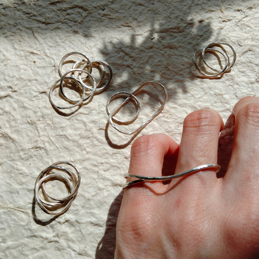 ラオスの職人と作った、純銀製の装身具いろいろ。指輪だけでなく、バングルなども。