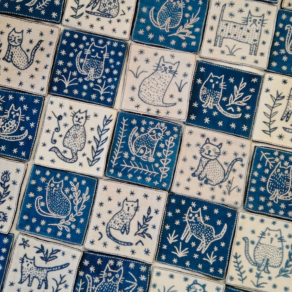 手刺繍のネコ柄コースター! お気に入りを見つけてください。
