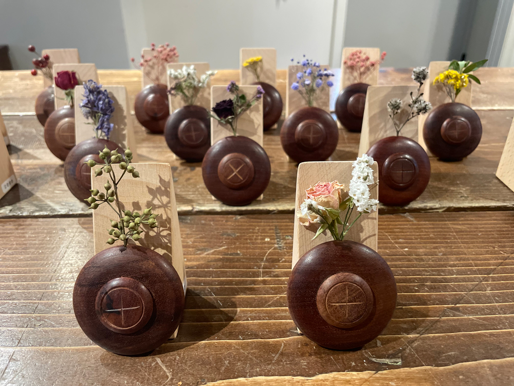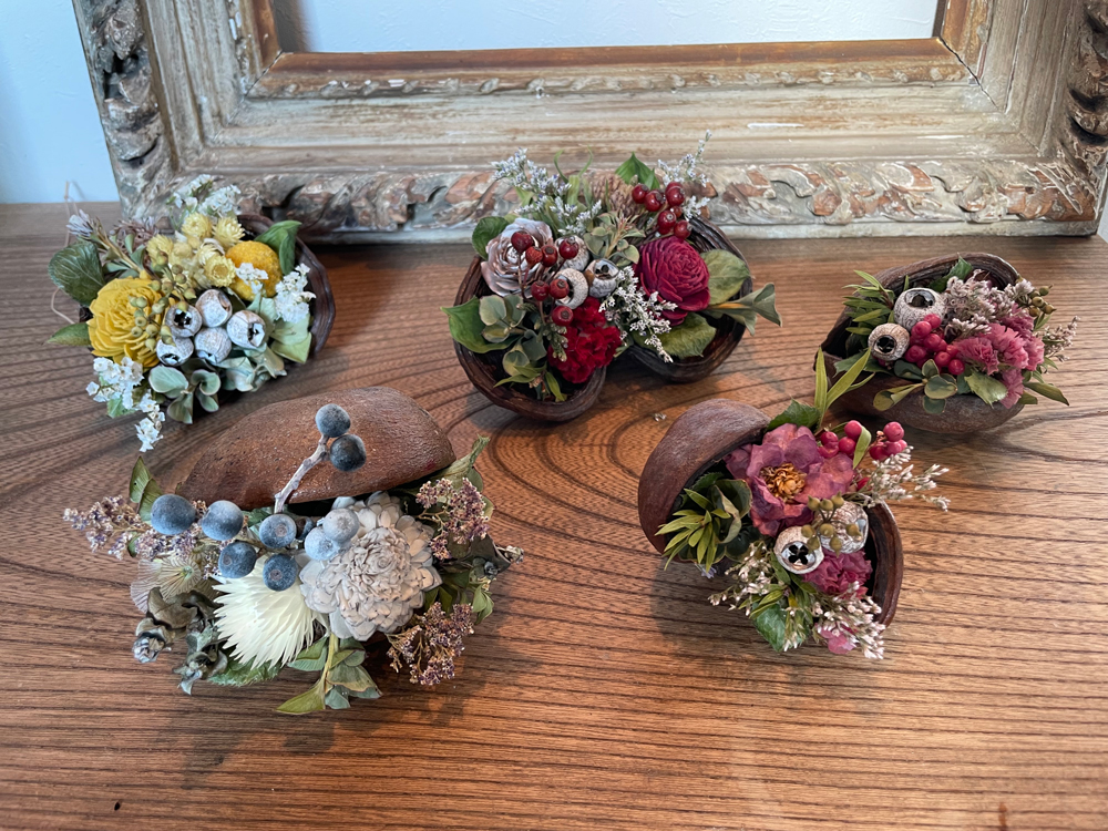人気のミニアレンジ。「パダム」という木の実にお花を詰めて。
