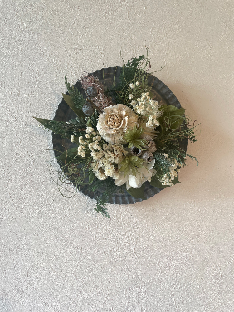 ブリキのお皿にドライフラワーアレンジ。壁掛けタイプです。