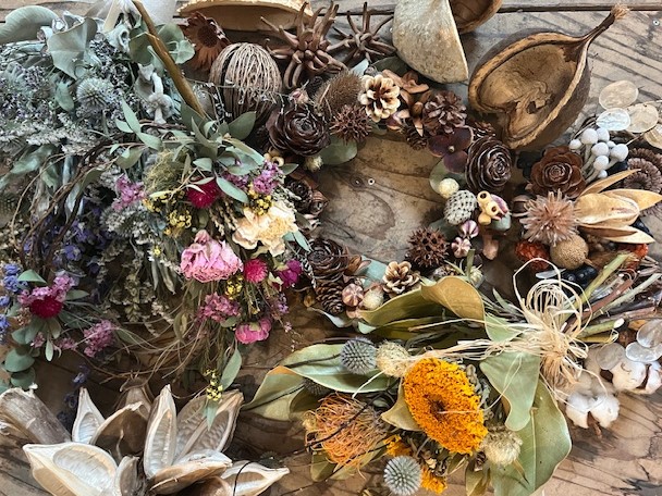 そして秋から冬の楽しみはリースやスワッグ(花束)作りです。ワークショップでは、地元の野山のつるや木の枝を使ったオリジナルのリースベースを作ってもらい、可愛い作品ができあがります。またおうち時間で楽しめるように、木の実や花、葉などのパーツも販売をしています。1つ、2つといろいろ選ぶ楽しみもありますよ。大人も縁日気分で楽しんでください。