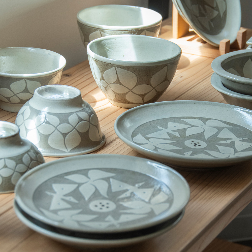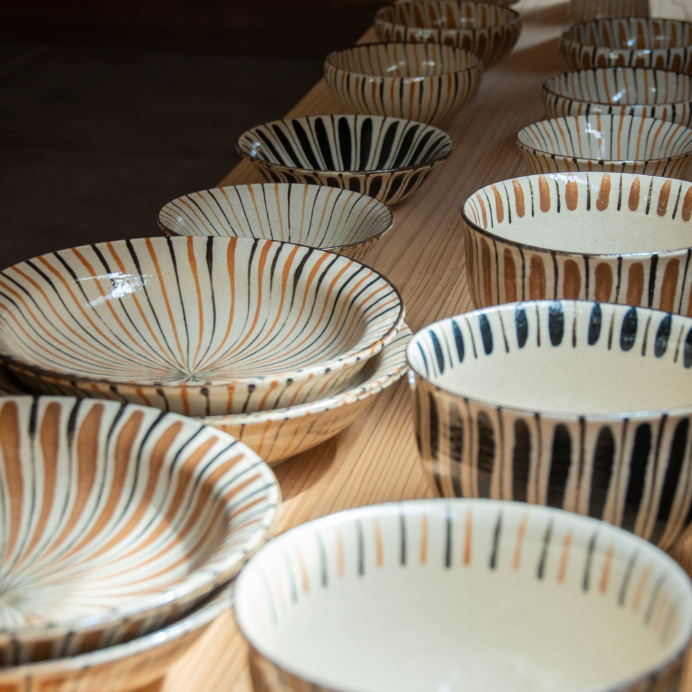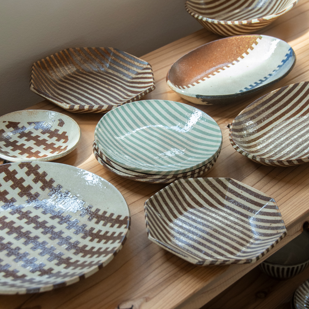 栃木県益子町で作陶されている「岡田崇人」さんのうつわ。“掻き落とし”といわれる化粧土を重ね柄を掻き出していく技法のうつわたちは、どんなお料理も引き立ててくれます。