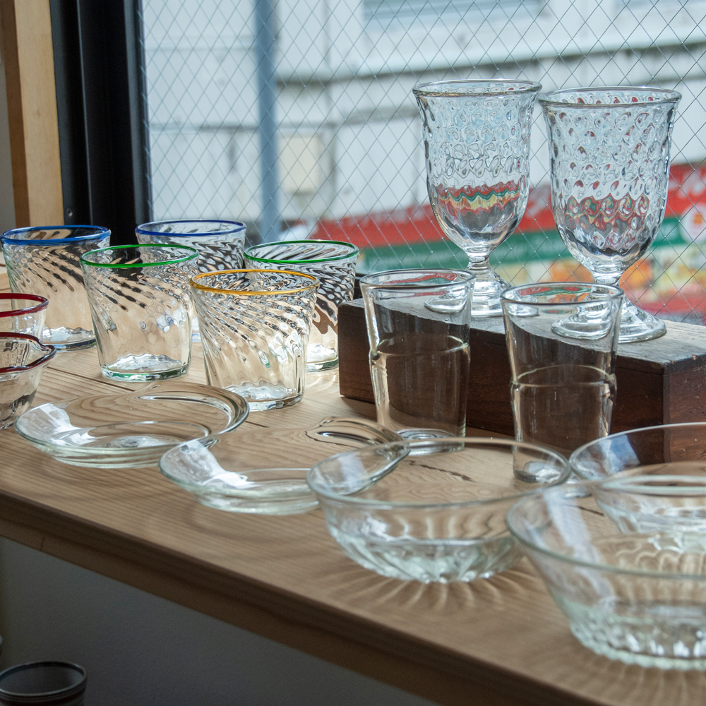 広島県福山市で制作されているカンナカガラス工房・「村松学」さんの吹きガラス。普段使いするのが楽しいガラスのうつわです。コップや小鉢、ワイングラスや花器なども。
