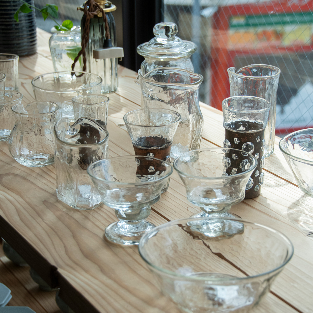 福岡県で手吹きガラスを作られている「太田潤」さんのガラスのうつわ。窓ガラスや酒瓶などを原料に溶かして作られるグラスは、吹きガラスにも関わらず陶器のようなぬくもりを感じます。