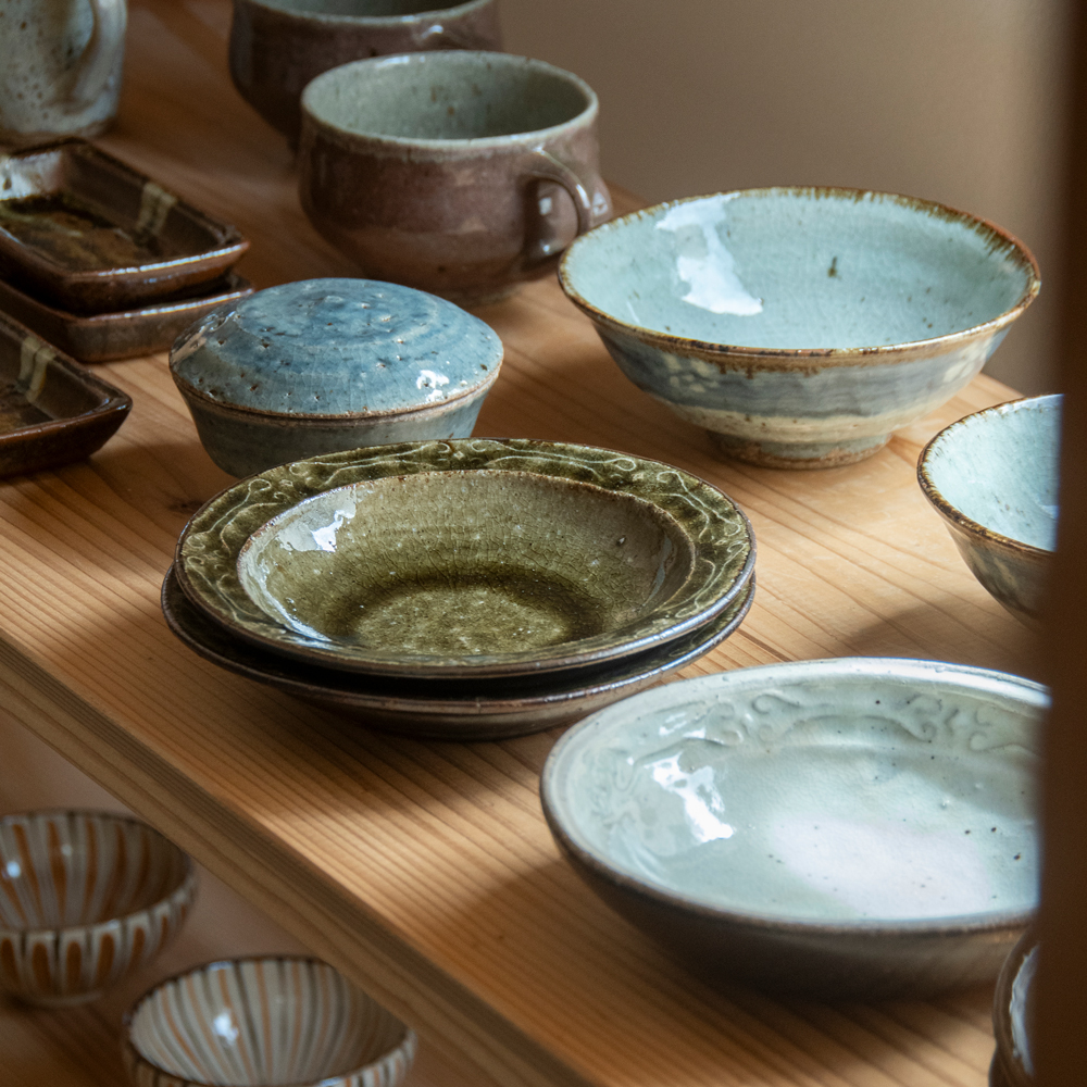 岡山県倉敷市で作陶される倉敷青木窯・「三宅康太」さんのうつわ。押紋や丸紋、掛け流しなど様々なお仕事をされます。押紋のうつわにお料理を盛り付けると余白もまた良いです。安心感のある厚みが、頼もしいうつわです。