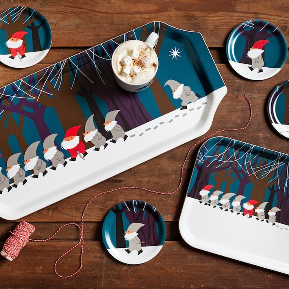 北欧の妖精「トムテ」が描かれた白樺製トレイ・コースター