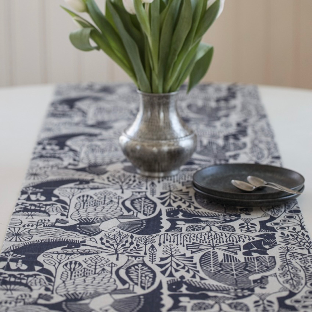 スウェーデンの森の精霊をイメージしてデザインされた、手染め生地のテーブルランナー