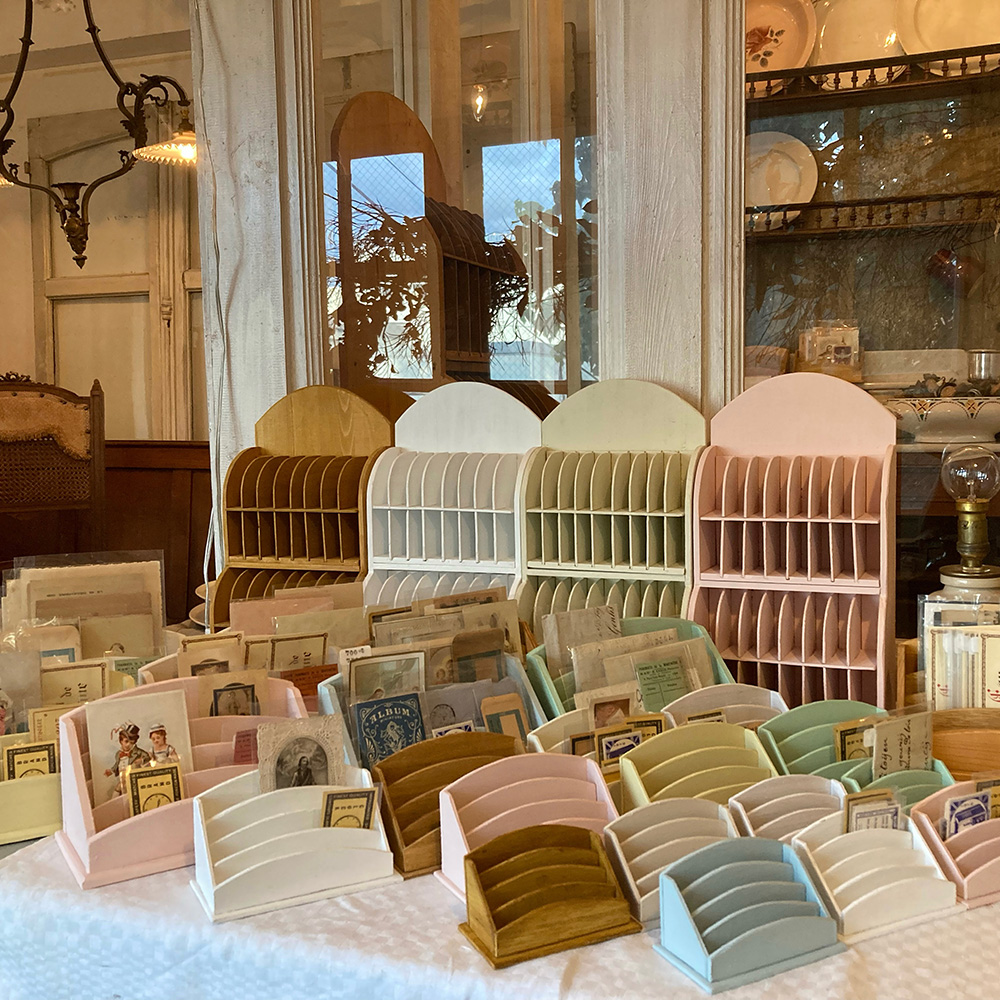 東京蚤の市には椅子や花台などの家具や照明、雑貨、レース、古い広告など紙ものをお持ちします。ハガキやカードのディスプレイに必須のレターラックもたくさん持っていきます。東京蚤の市限定のお得セットも販売する予定ですので楽しみにしてください。