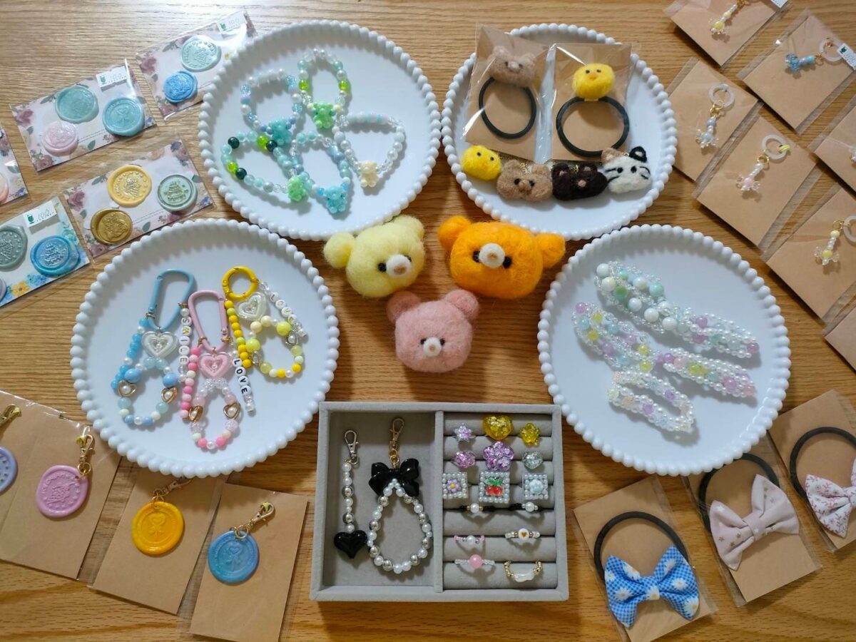東京開催のイベントによく出店していて、こどもも大人も“かわいい”と思ってもらえるビーズアクセサリー、羊毛フェルトやシーリングスタンプのチャームなどを作っています。特におすすめの商品は、カラフルなビーズを使って編み込まれたブレスレット、くまやひよこがモチーフの羊毛フェルトチャーム、手帳やバックにつけられるジャラジャラキーホルダーです。