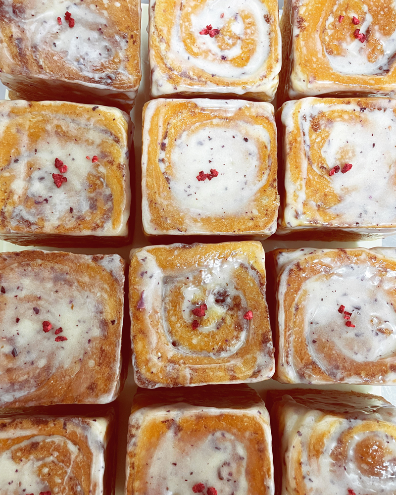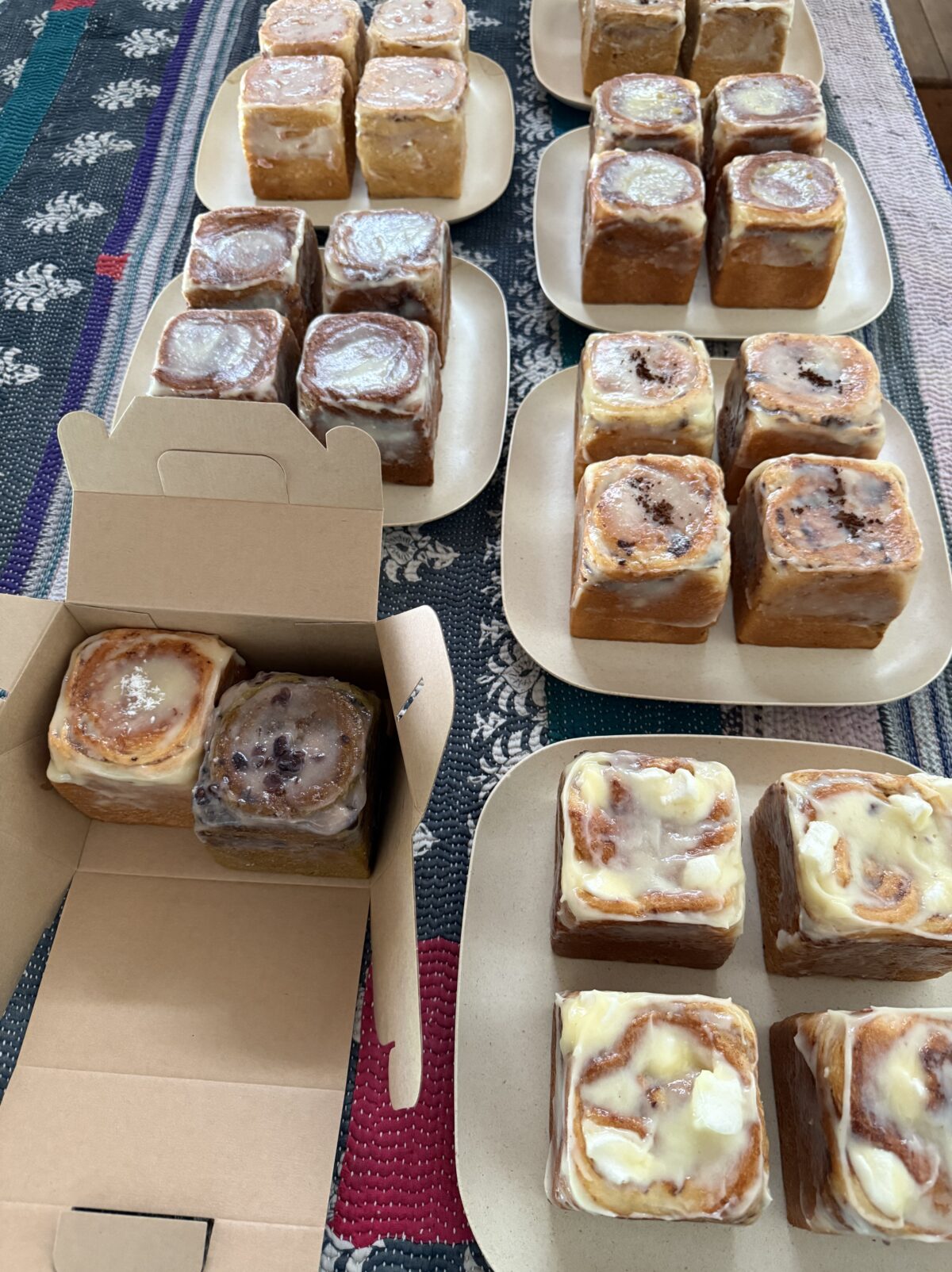 3日間参加する「こむぎフェス」限定の特別なフレーバーのシナモンロールを試作中! また通常は店頭並ばない旬の焼き菓子や、相性ピッタリの少し珍しいセイロンティーもご用意します。