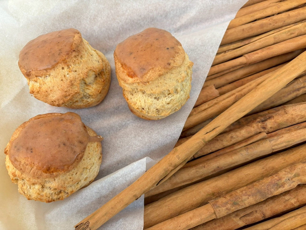 「スコーン(ダブルシナモン)」セイロンシナモン香るしっとりざっくりスコーン生地にシナモンアイシングをしています (他、レモンシナモン、紅茶、シナモンリンゴ、栗とヘーゼルナッツ)。