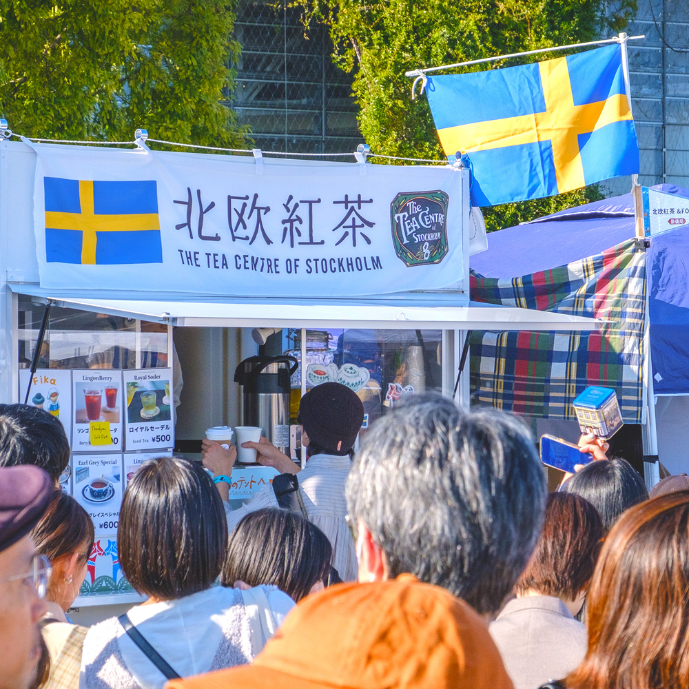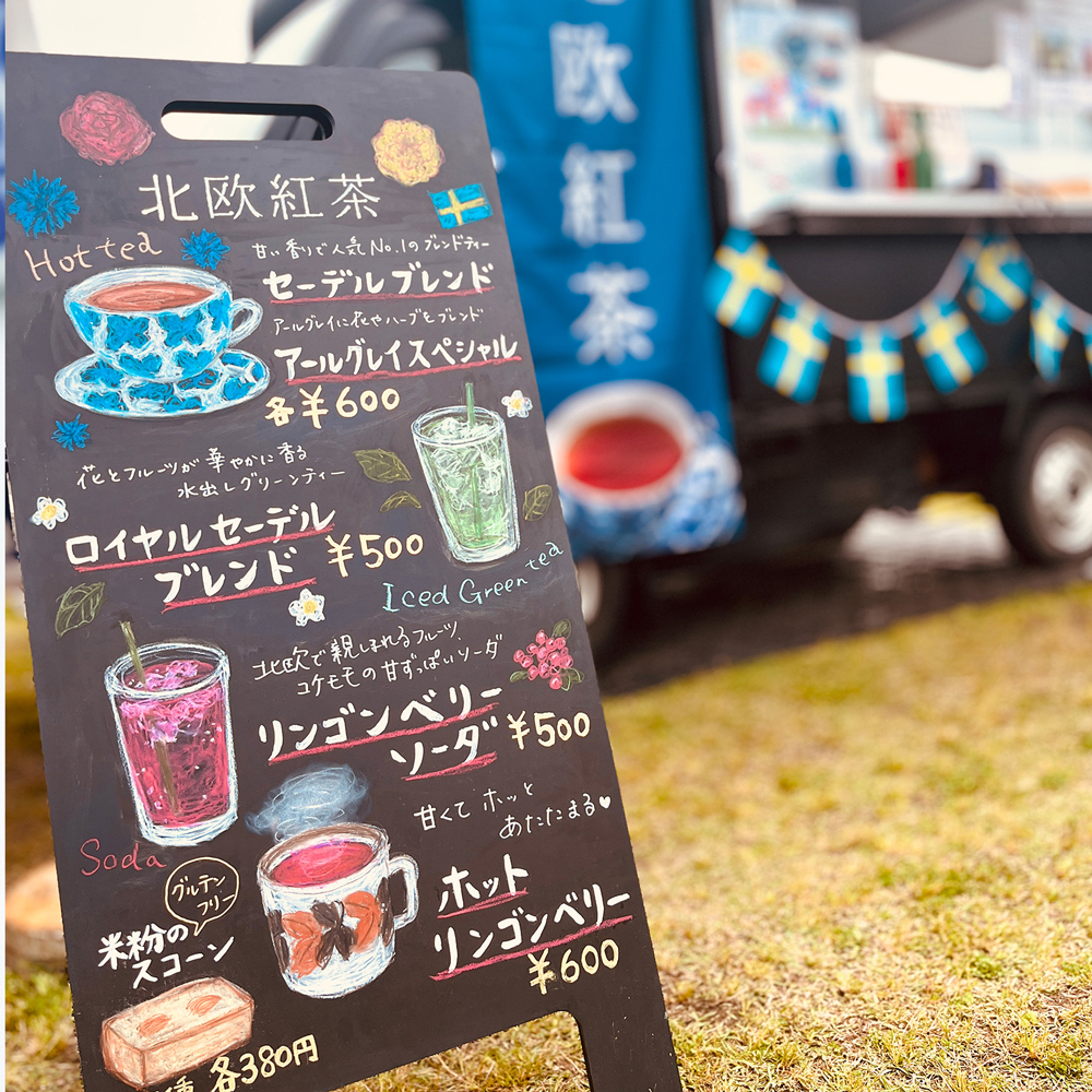 併設するキッチンカーでは北欧紅茶(ホット・アイス)、北欧のリンゴンベリーを使ったベリーソーダ、ミルクティーをご用意しています。スウェーデン国旗が目印!