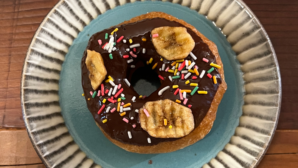 バナナを生地に練り込み、チョコでアイシング。カラースプレーとフライドバナナをトッピング。パーティードーナツ!