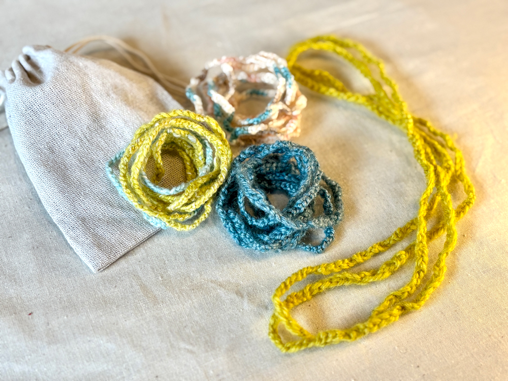 いがまる弟が、指とかぎ針を使って毛糸で編んだあやとり紐。こどもの手にぴったりサイズ。持ち歩きに便利な小さな袋付き。
