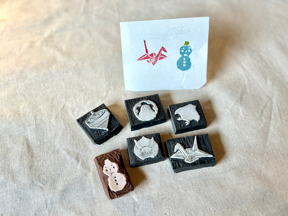 和のモチーフの消しゴムはんこ。細かいところを彫刻刀で彫るのは難しいけど、丁寧に仕上げたくて、ふたりでがんばりました。