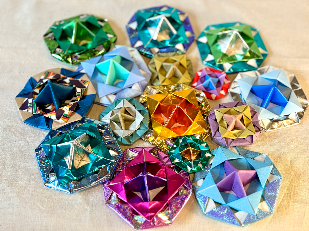よく回る折り紙のコマ。丁寧に折ってたくさん作りました! いろんな色や柄があるので、楽しみにしていてください。