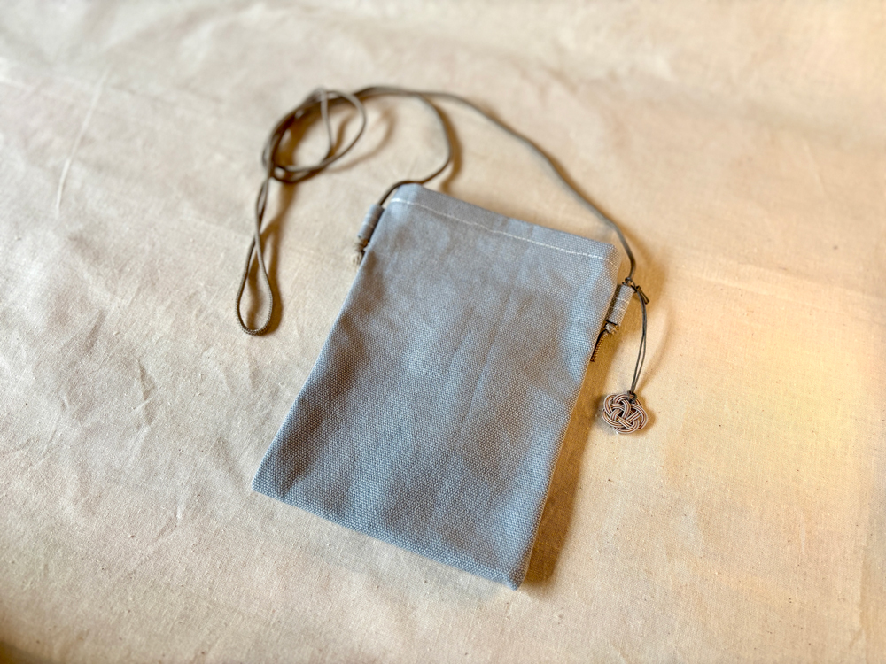 ちょこっとお出かけに便利なキャンバス生地のサコッシュ。おやつやスマホにぴったりサイズ。水引で作ったストラップ付き。