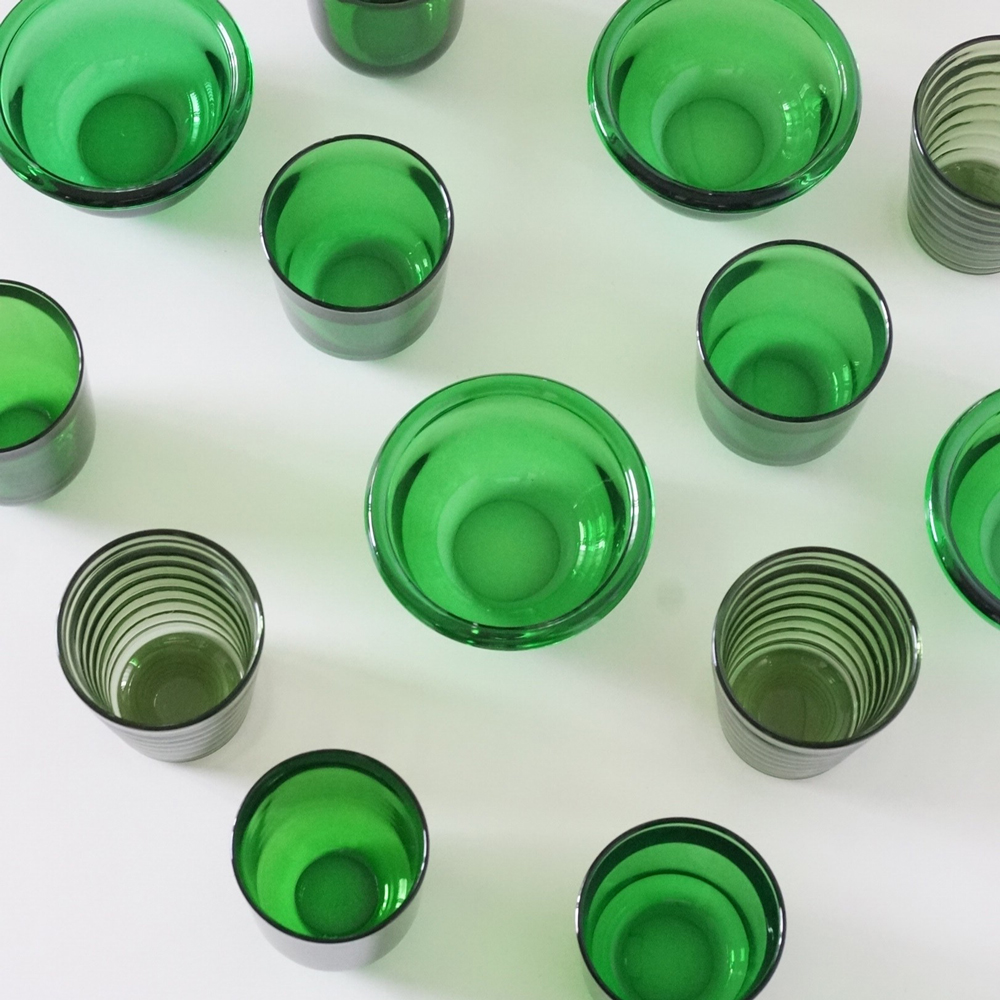 フィンランドのヴィンテージガラス。カイフランクやアイノアアルトデザインのグリーンを集めてみました。冬の光を感じていただけるシリーズです。