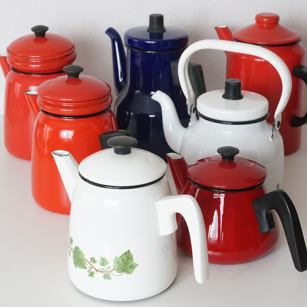 スウェーデン「コクムス」の古いヴィンテージ琺瑯ポット。薪ストーブやキャンプにはもちろん、お部屋のインテリアとしても存在感のあるチャーミングな琺瑯ポットです。