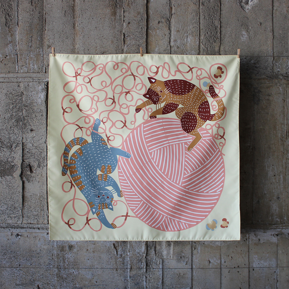「kata kata(カタカタ)」は、松永武と高井知絵による染色作家ユニットです。私たちは、日本の伝統的な染色技法「型染め」をベースに、いきものや植物、日常に溢れる物語を布の上に描いています。型染めとは、渋紙を彫って作った型紙を使い、布や和紙に糊を置いて防染することで模様を表す技法です。型染めには、技法の特性上さまざまな制約があります。私たちはその制約の中で模様を探し出す面白さに魅力を感じ、布を広げた時に会話が生まれるようなデザインを大切にしています。手ぬぐい、ハンカチ、風呂敷やタオルなど、暮らしに寄り添う布小物を制作し、日常に彩りを添える存在でありたいと考えています。国内外での展示活動に加え、企業とのコラボレーションや商品デザイン、ワークショップも行い、型染めの魅力をより多くの方に届ける活動を続けています。どうぞお気に入りの一枚を見つけてください。