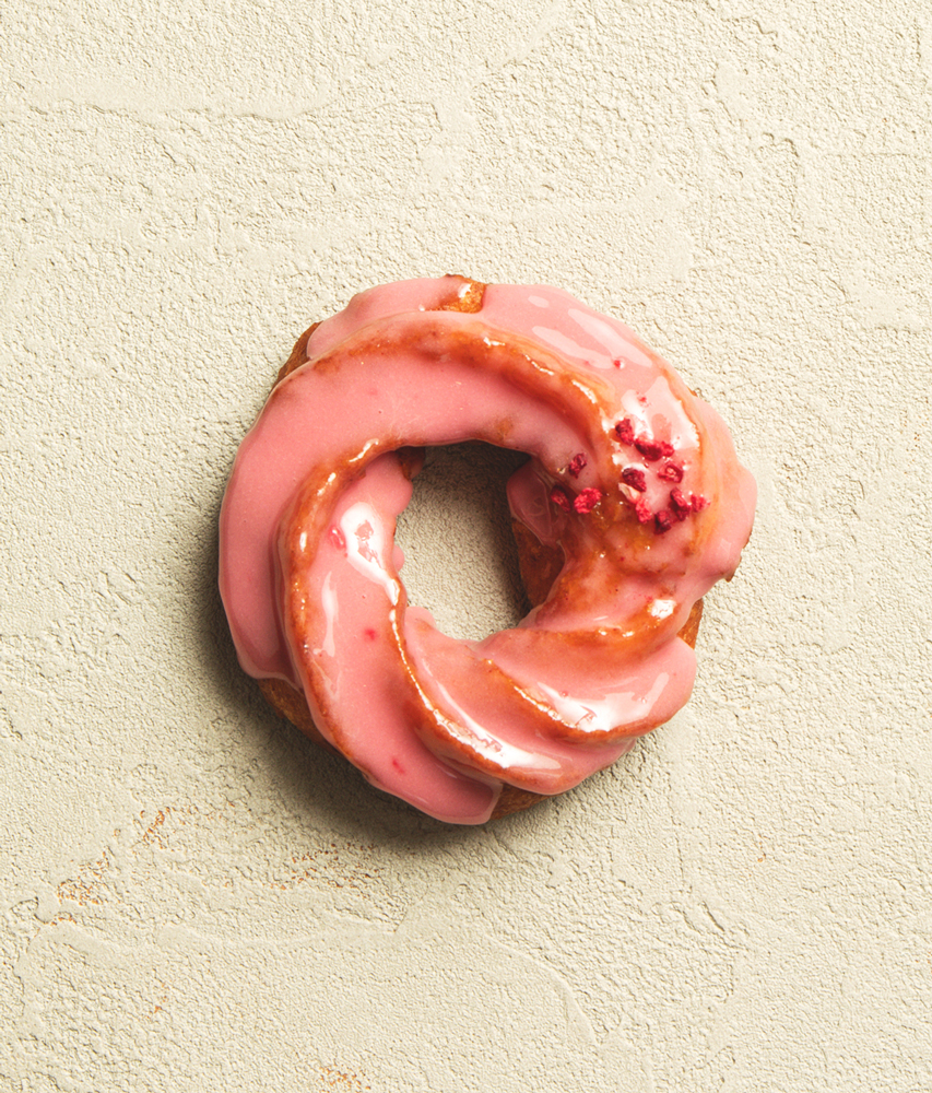 ピンク色の甘酸っぱいベリーアイシングのかかったふわもちフレンチクルーラー
