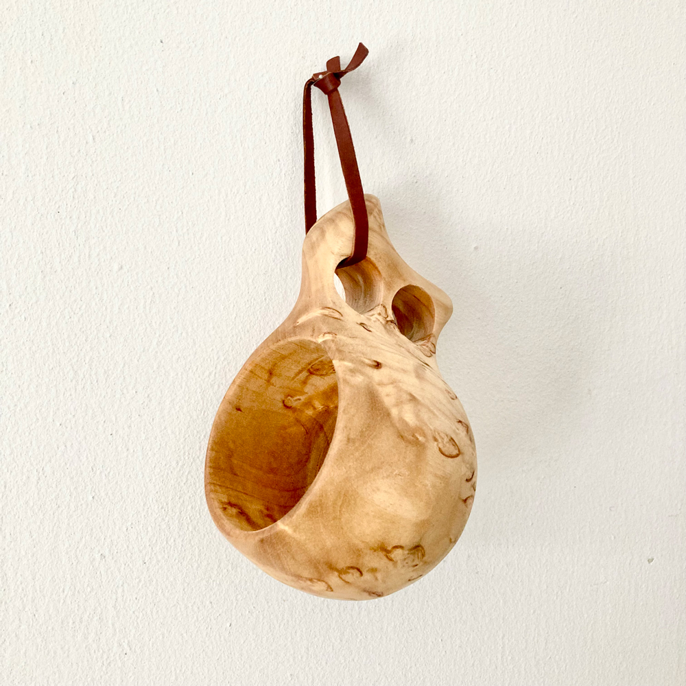 フィンランドの伝統工芸品ククサ。白樺のコブをくり抜いて作られた贅沢なカップに、トナカイの革製のストラップが付いています。アウトドアにもおすすめです。