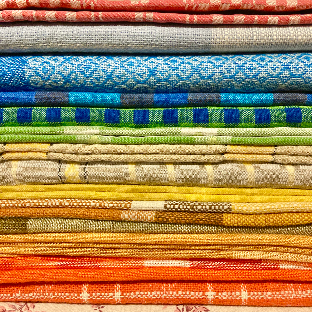 フィンランドやスウェーデンで買い付けた古いテーブルクロス類。北欧らしい配色や模様、どこかレトロ感もあって魅力です。