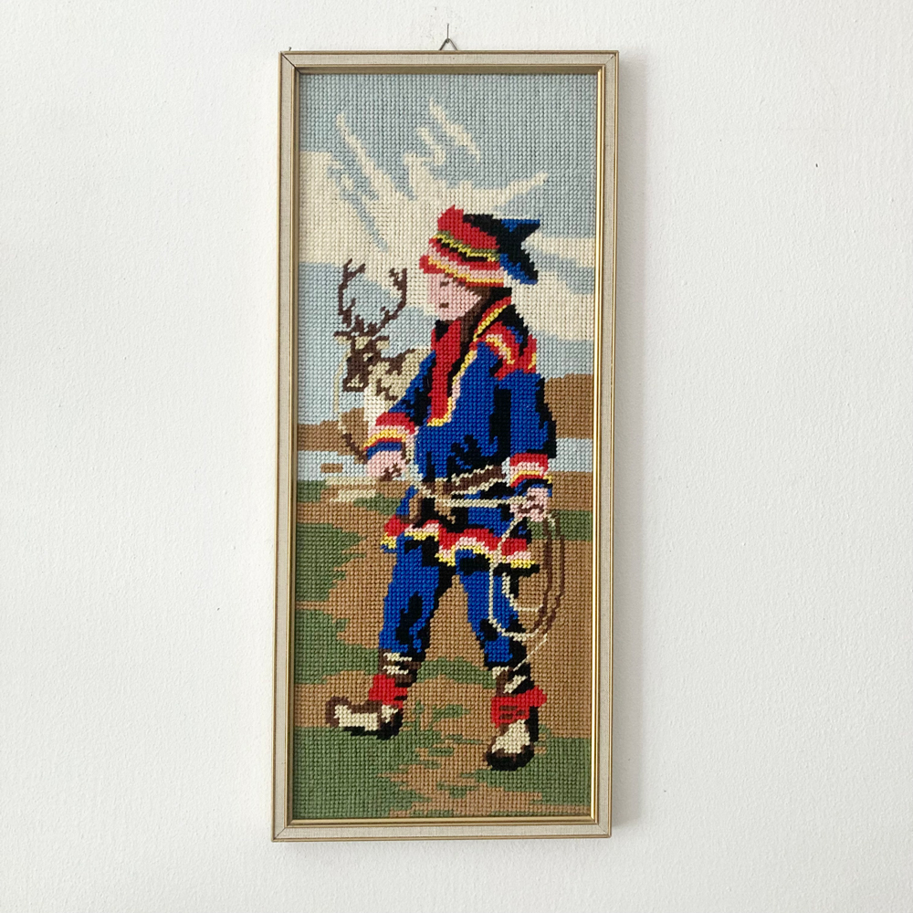 フィンランドの蚤の市で一目惚れした作品。サーミの男性がクロスステッチで表現されています。壁のアクセントとして映える細長いフレームも特徴的です。