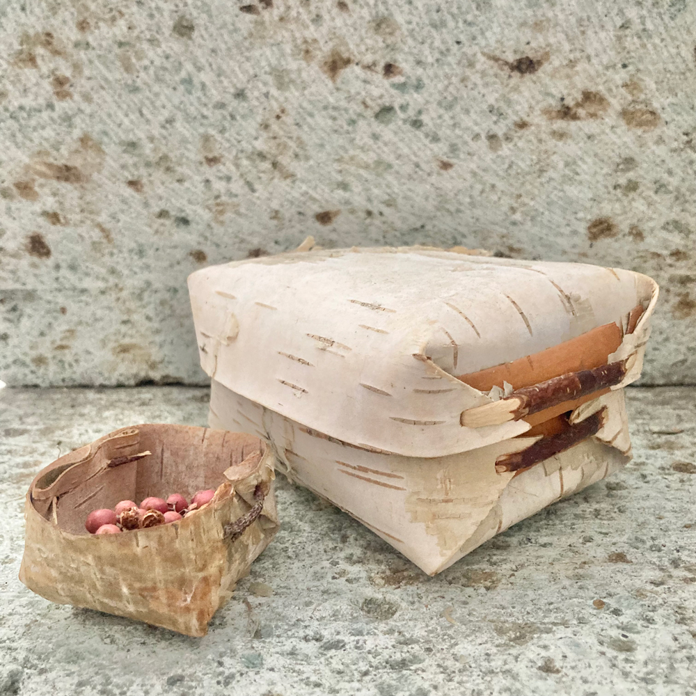 薄く剥いだ白樺の樹皮を使った蓋付きの入れもの。樹皮を留める部分には柳のツルが使われています。フィンランドの森で生まれた、自然を感じるハンドクラフトです。