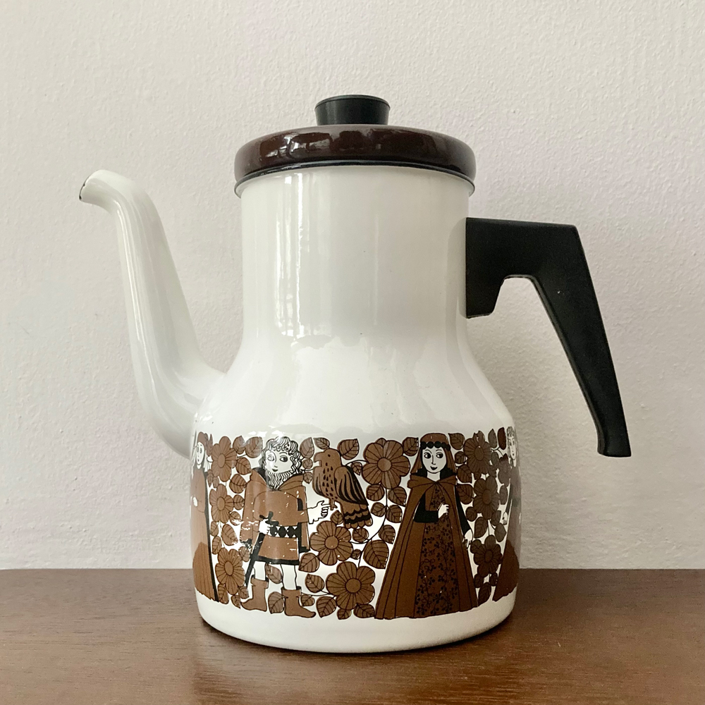 フィンランドの琺瑯メーカー、FINEL社のコーヒーケトル。1970年代に製造されたユニークなシリーズで、中世の騎士物語がぐるりと描かれています。