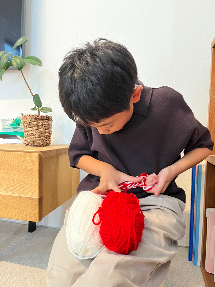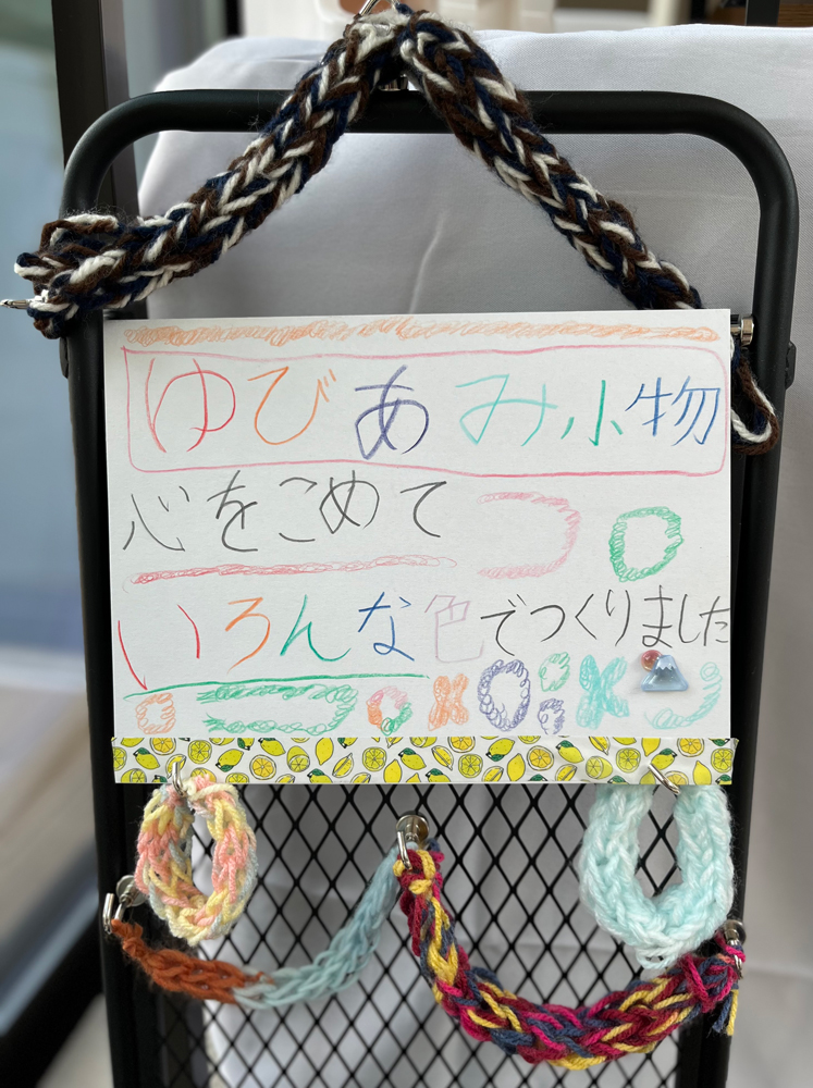 ゆびあみは、小学4年生のしゅんたの手作りです。物作りが大好きで、心を込めて編みました。