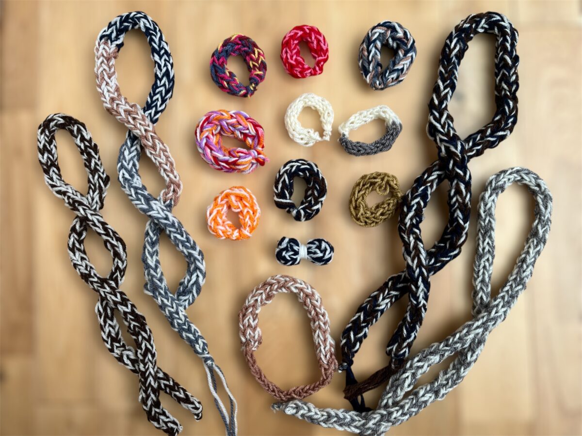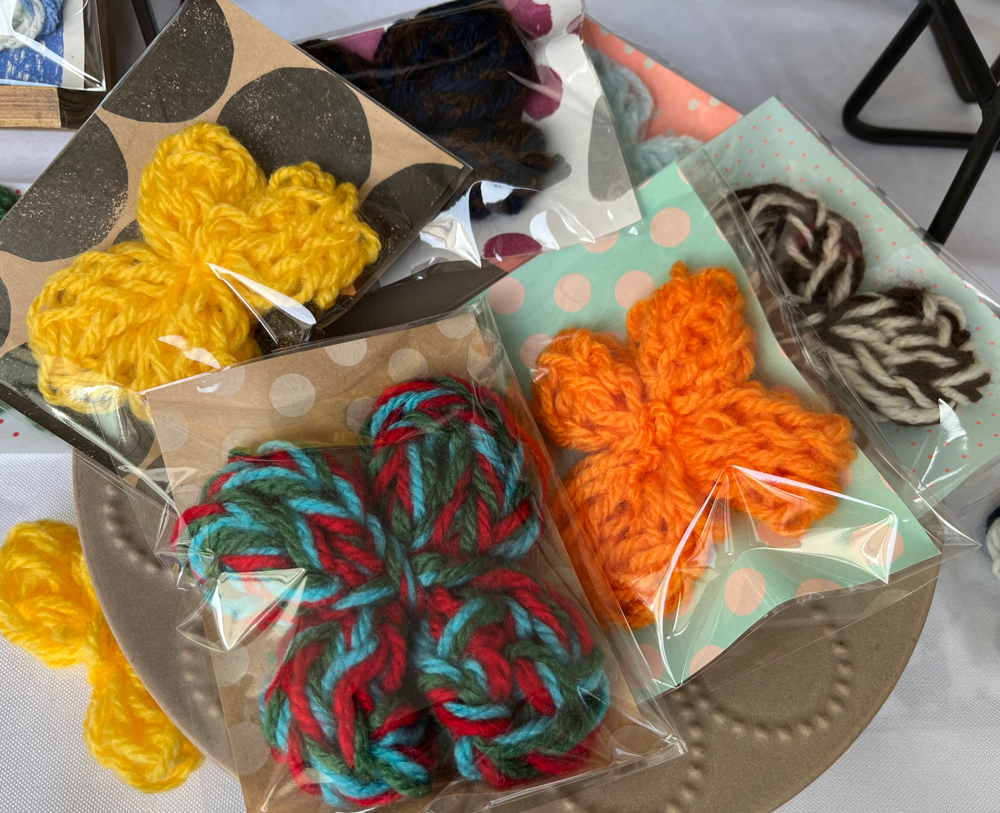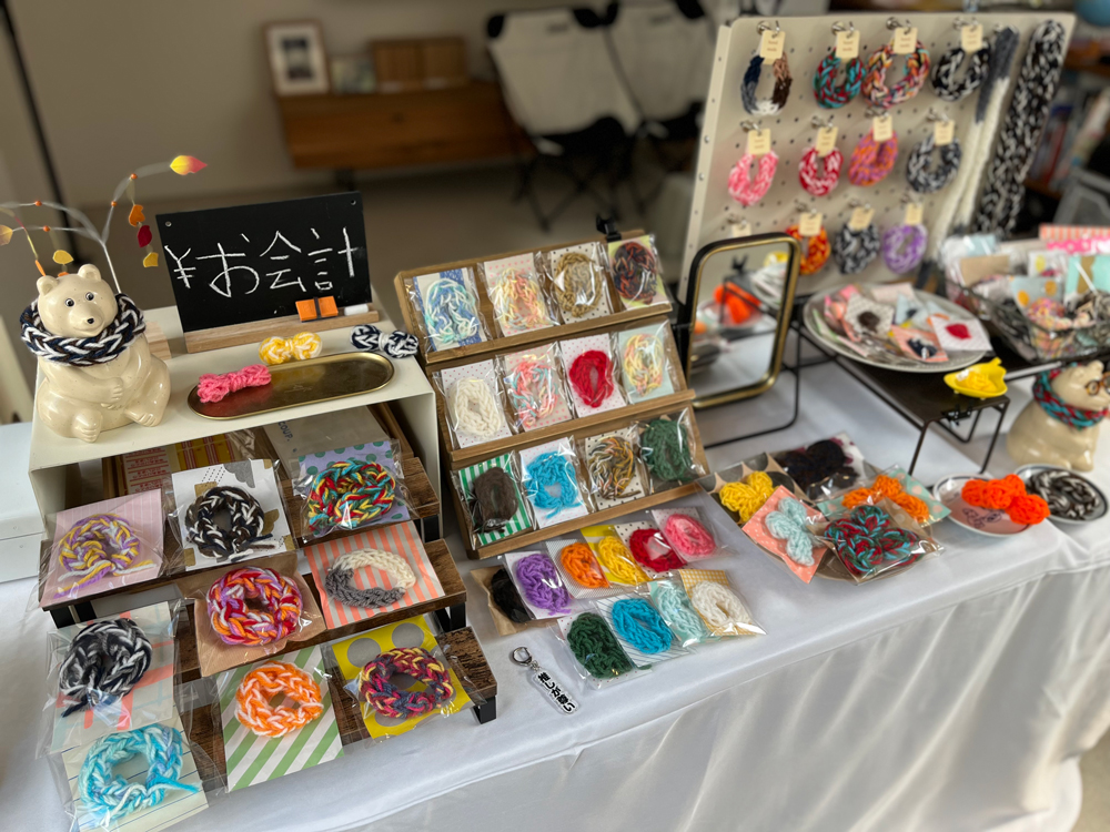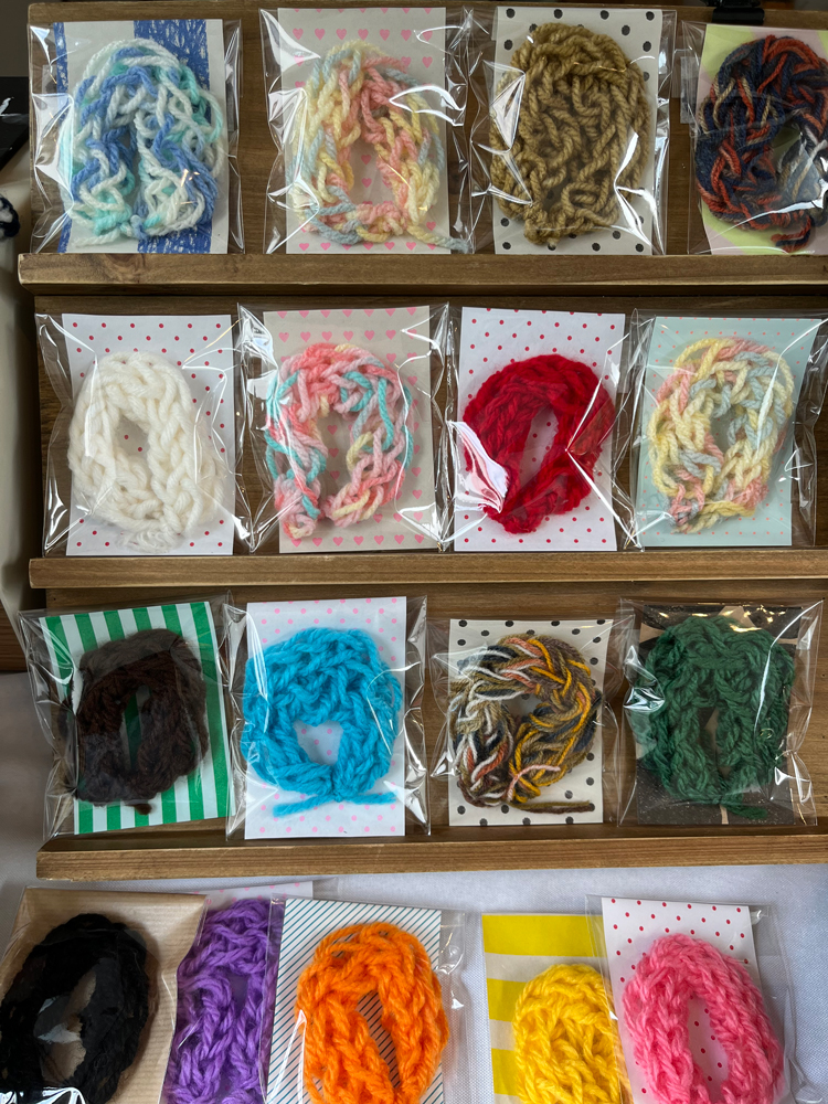 カラフルなゆびあみ小物を可愛くラッピングしました。ぜひお好きな色やデザインを見つけてくださいね。